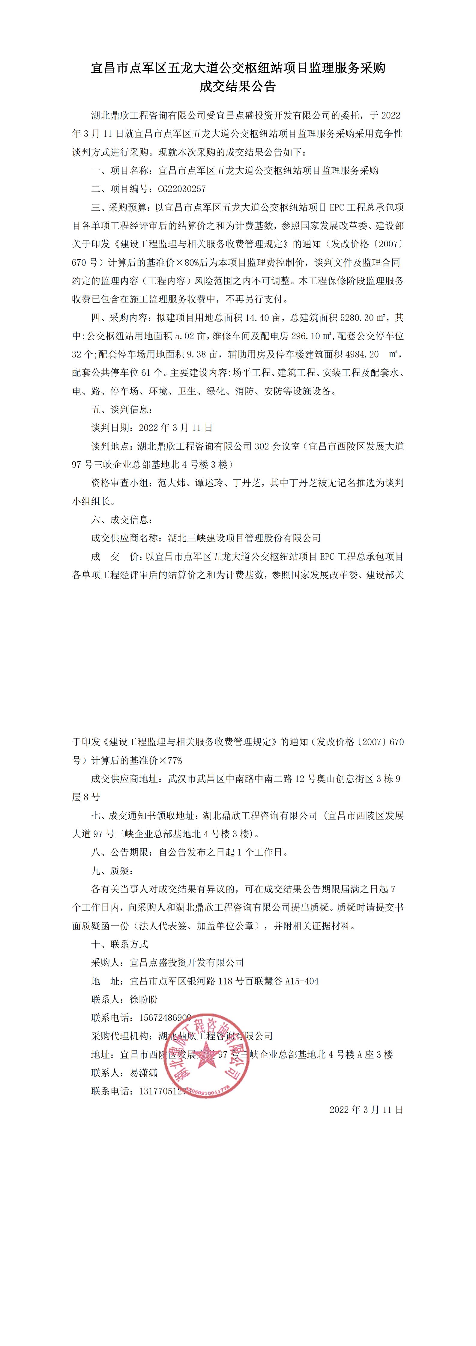 宜昌市點(diǎn)軍區(qū)五龍大道公交樞紐站項(xiàng)目監(jiān)理服務(wù)采購(gòu)成交結(jié)果公告