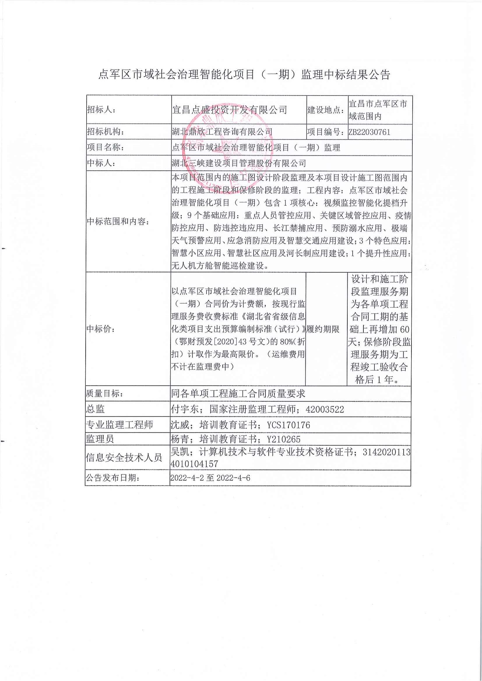 點(diǎn)軍區(qū)市域社會治理智能化項(xiàng)目(一期)?監(jiān)理中標(biāo)結(jié)果公告