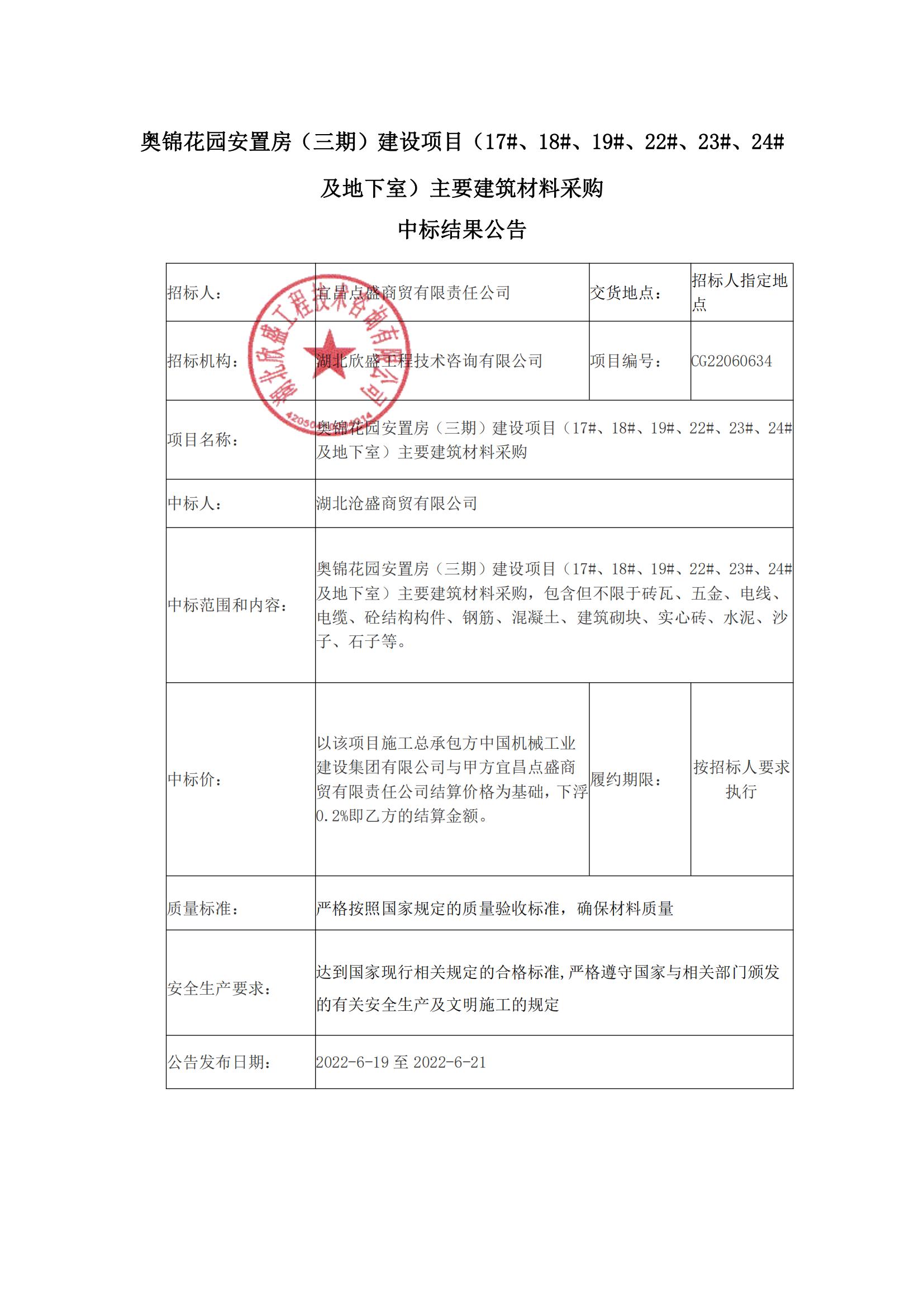 奧錦花園安置房(三期)建設項目(17#、18#、19#、22#、23#、24#及地下室)主要建筑材料采購中標結果公告