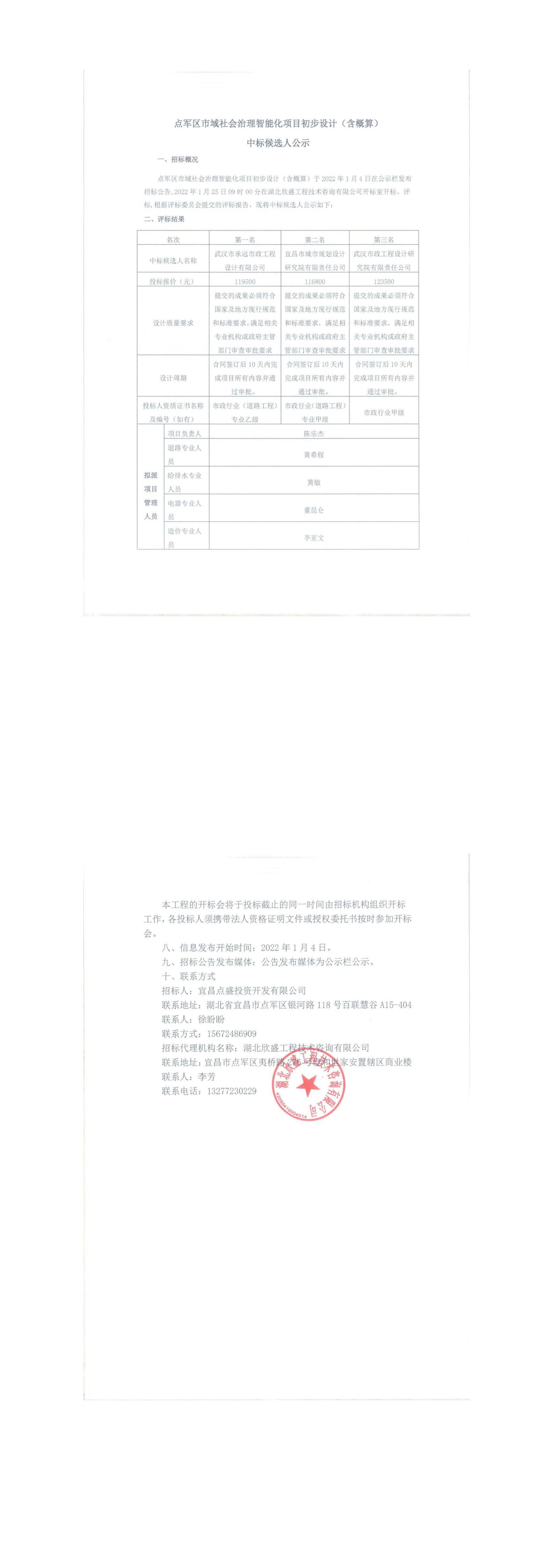 點軍區(qū)市域社會治理智能化項目初步設(shè)計(含概算)中標(biāo)候選人公示