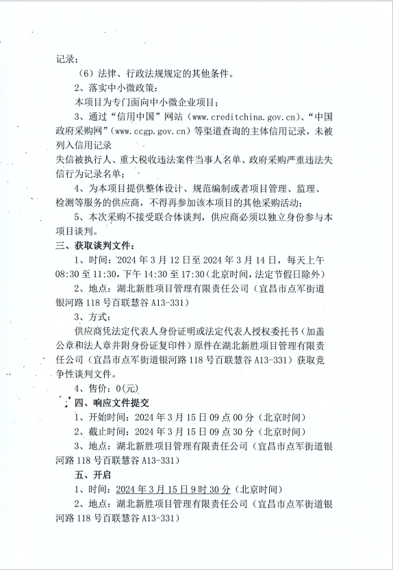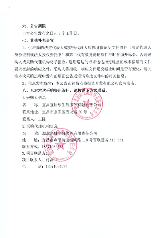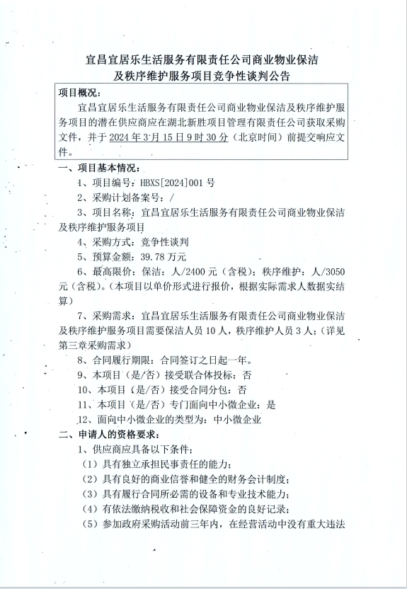 宜昌宜居樂生活服務(wù)有限責(zé)任公司商業(yè)物業(yè)保潔及秩序維護服務(wù)項目競爭性談判公告