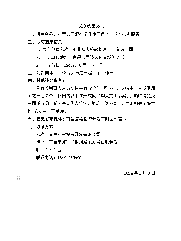 點軍區(qū)石堰小學(xué)遷建工程(二期)檢測服務(wù)成交公告