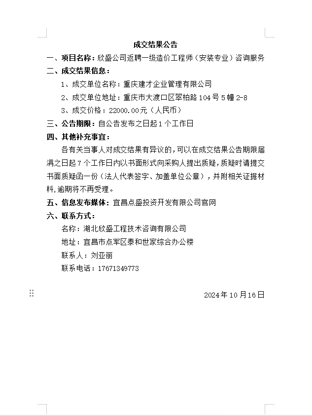 欣盛公司返聘一級造價工程師(安裝專業(yè))咨詢服務(wù)成交公告