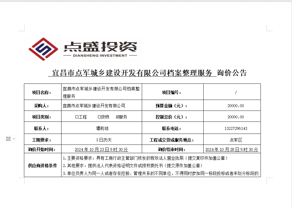 宜昌市點(diǎn)軍城鄉(xiāng)建設(shè)開(kāi)發(fā)有限公司檔案整理服務(wù)詢價(jià)公告