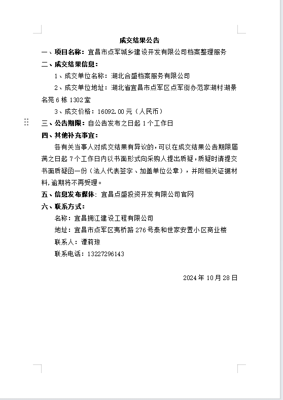 宜昌市點(diǎn)軍城鄉(xiāng)建設(shè)開發(fā)有限公司檔案整理服務(wù)成交公告