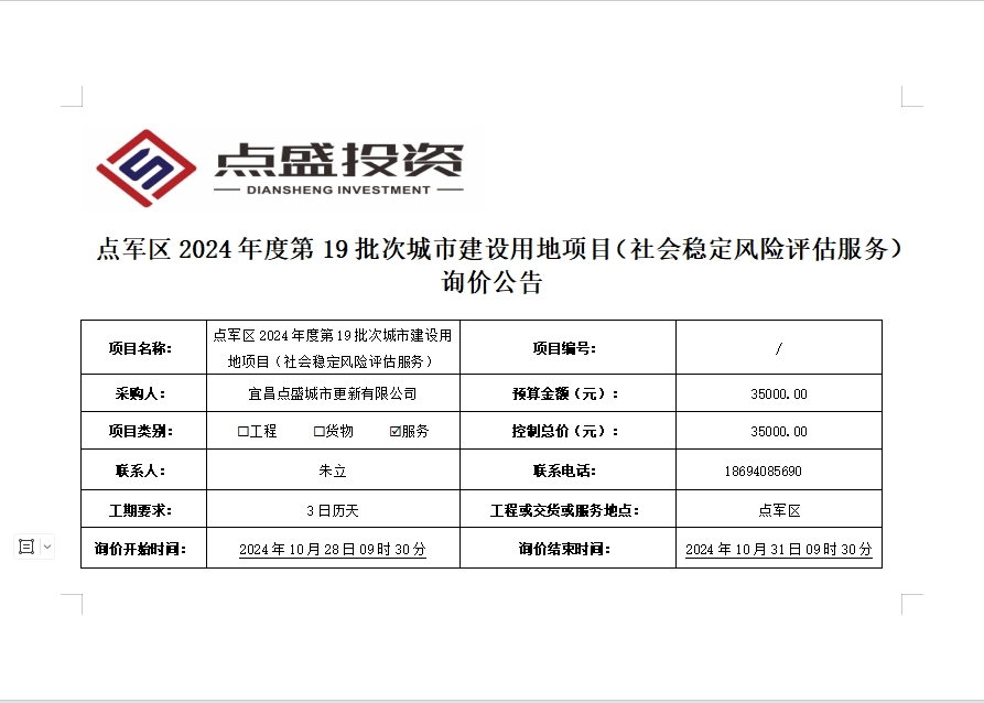 點(diǎn)軍區(qū)2024年度第19批次城市建設(shè)用地項(xiàng)目(社會穩(wěn)定風(fēng)險(xiǎn)評估服務(wù))詢價(jià)公告