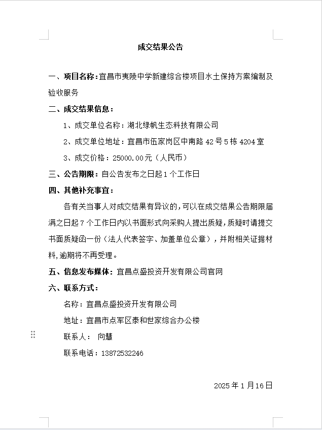 宜昌市夷陵中學新建綜合樓項目水土保持方案編制及驗收服務(wù)成交公告