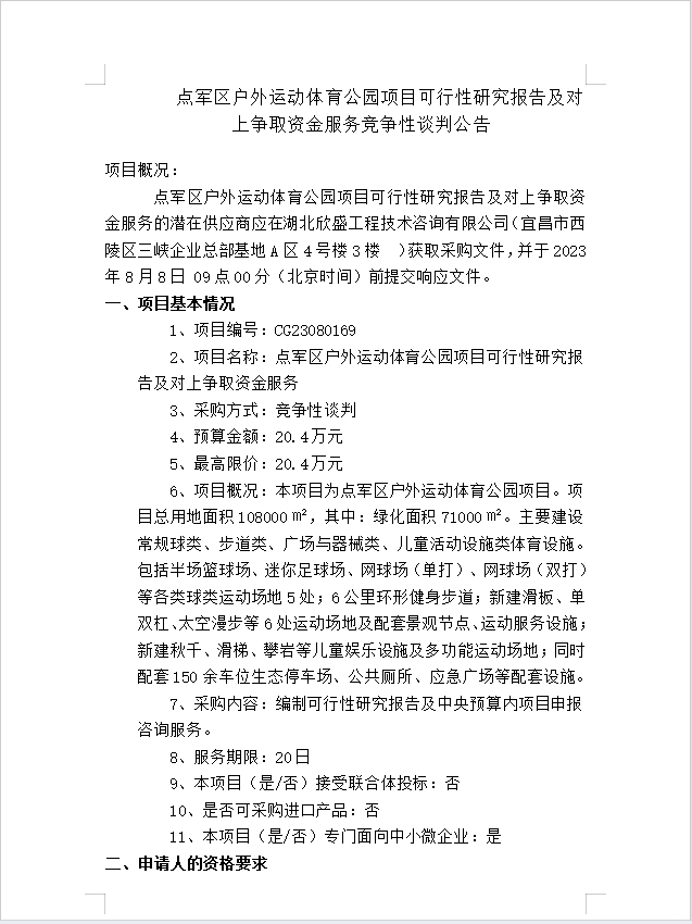 點軍區(qū)戶外運動體育公園項目可行性研究報告及對上爭取資金服務談判公告